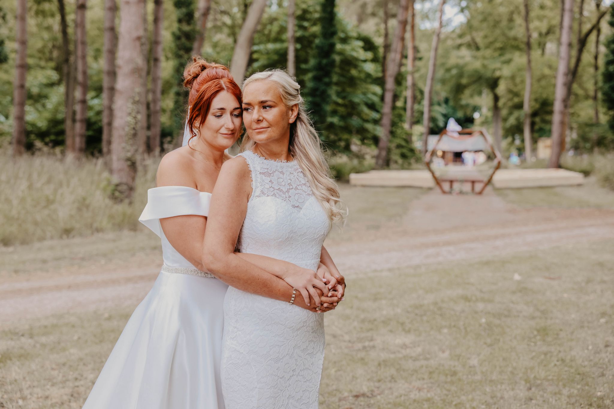 wedding couple in view looking up to safari tent